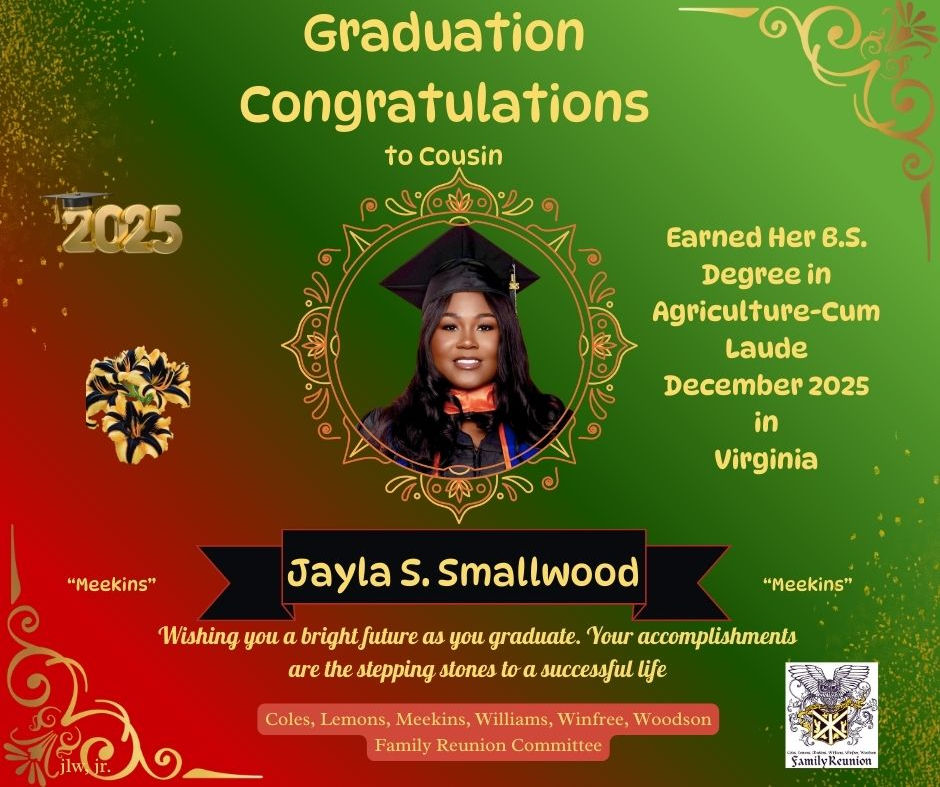Graduated from high school in Virginia May 2024. She is the daughter of Sherekia Winston, granddaughter of La"Keisha A. Smith, great granddaughter of Gingia Jones, great-great granddaughter of Mary D. Bowen Jones, great-great-great granddaughter of Daisy Bell Meekins.